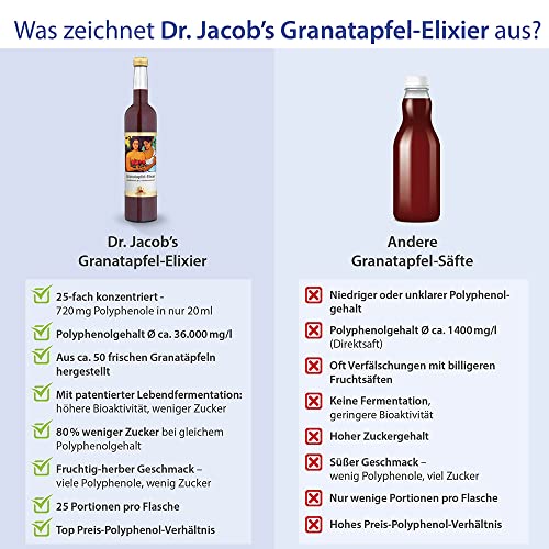 Ogni bottiglia di elisir di melograno Dr. Jacob’s contiene il succo e la polpa di oltre 50 mele maturate al sole – spremuto fresco, delicatamente lavorato e concentrato in polifenoli di melograno vibranti e fermentati.