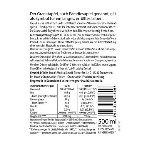 La porzione giornaliera di 20 ml contiene 720 mg di polifenoli (di cui circa 500 mg di punicalagina) e 400 mg di potassio, che supporta il mantenimento di una normale pressione sanguigna. Già 10 ml contengono circa la stessa quantità di polifenoli di 1 bicchiere di succo di melograno fresco (250 ml)1,2.
